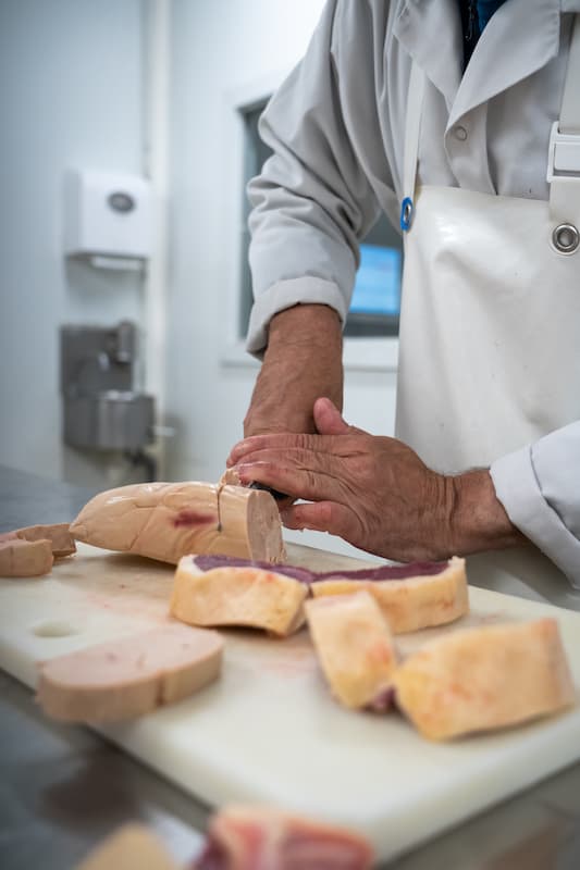 Tout commence par la découpe minutieuse du foie gras cru.