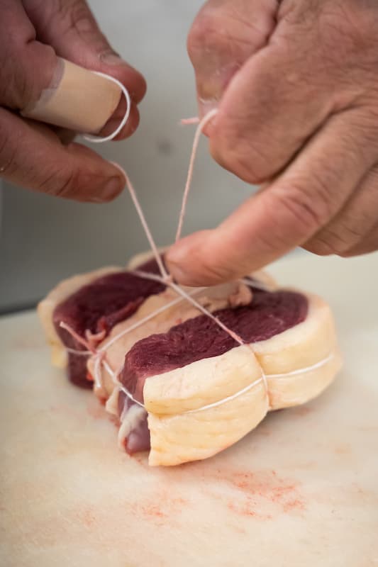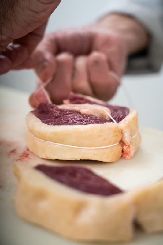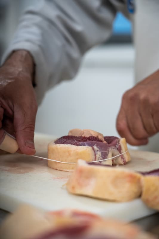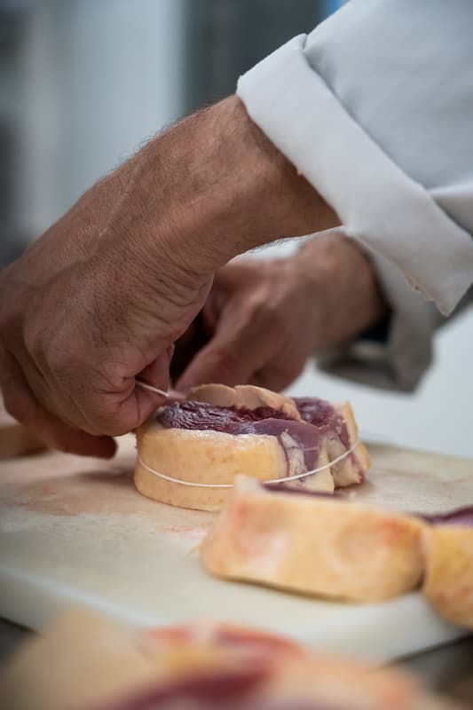 Vient ensuite une étape déterminante : le ficelage à la main. Chaque palet est méticuleusement ficelé pour maintenir le foie gras en place, tout en assurant une cuisson homogène et une présentation impeccable une fois le plat servi.