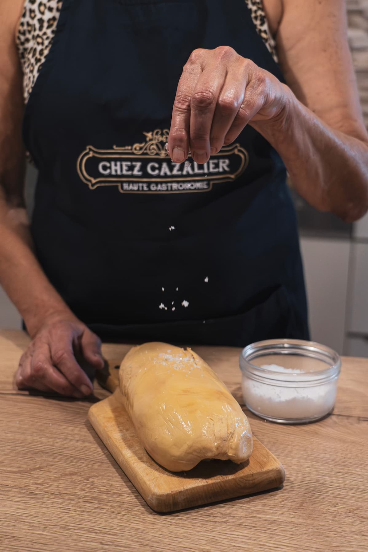 Avec précaution, saupoudrez de sel et de poivre, en quantité juste et équilibrée pour rehausser sans masquer le goût délicat du foie. Les doses classiques sont les suivantes : 12g de sel et 3g de poivre pour 1kg de Foie.